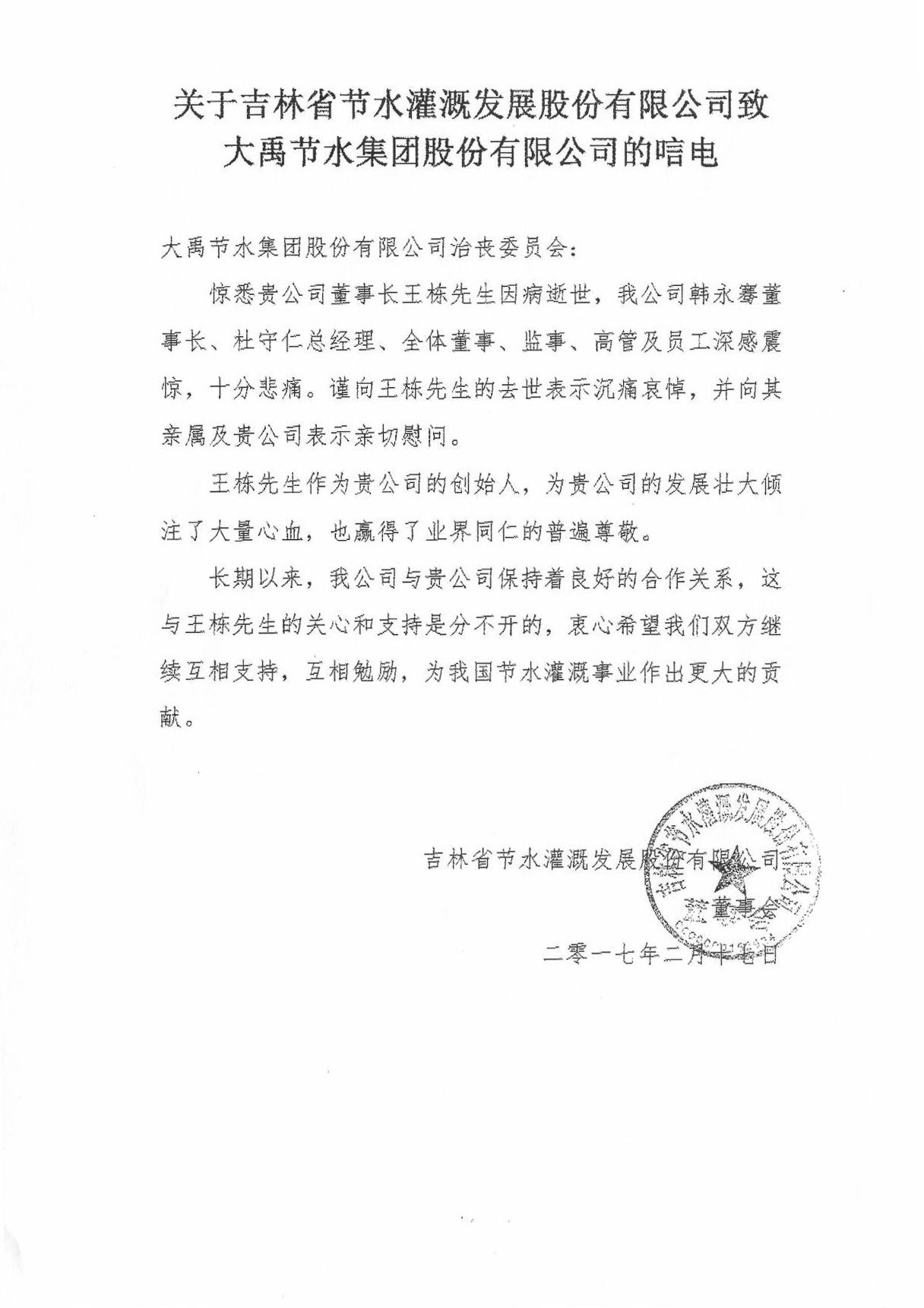 吉林省节水浇灌生长股份有限公司唁电