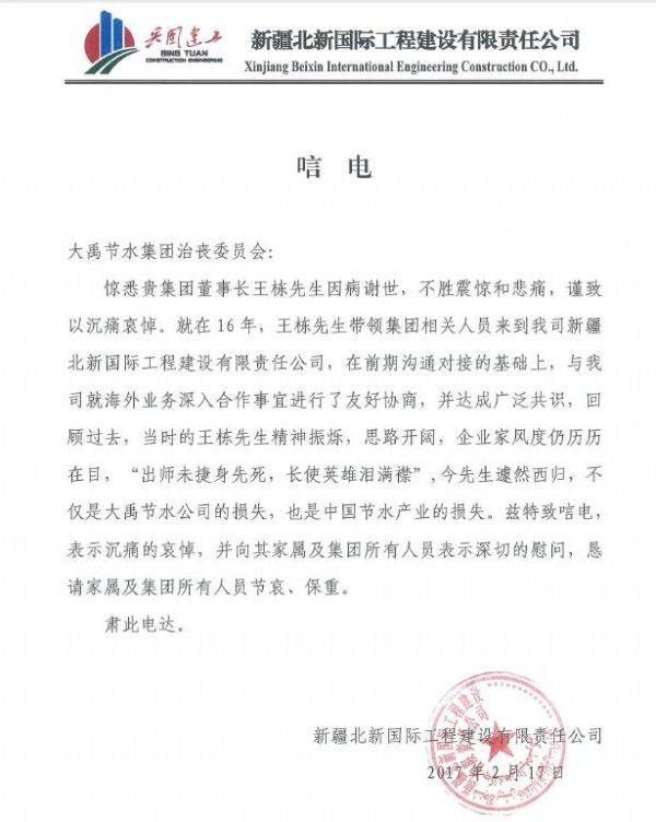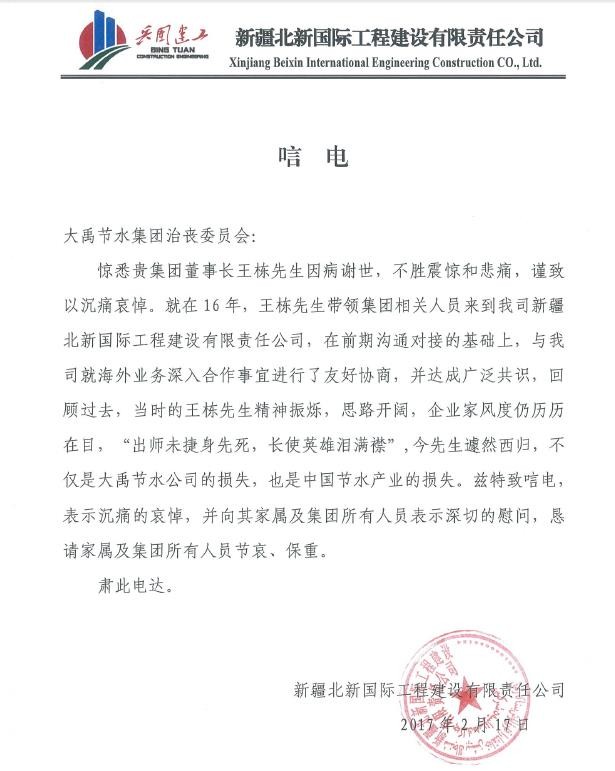 新疆北新国际工程建设有限责任公司唁电