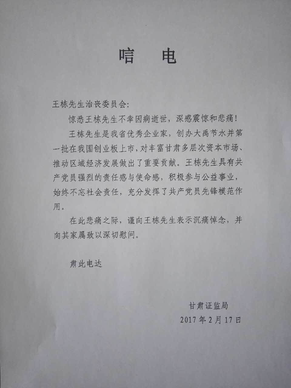 甘肃省证监局唁电