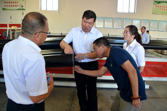 7月28日,,,,,,,河北省邢台市隆尧县水务局党组成员、副局长李计东一行莅临新宝gg节水集团调研考察。。。。。。。新宝gg节水集团公司总裁谢永生、董事会秘书王光敏、财务总监李福武等公司向导陪同考察。。。。。。。
