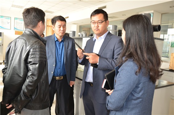 新宝gg节水集团公司董事长王浩宇在新宝gg研究院实验室向投资总监王芳先容实验室情形