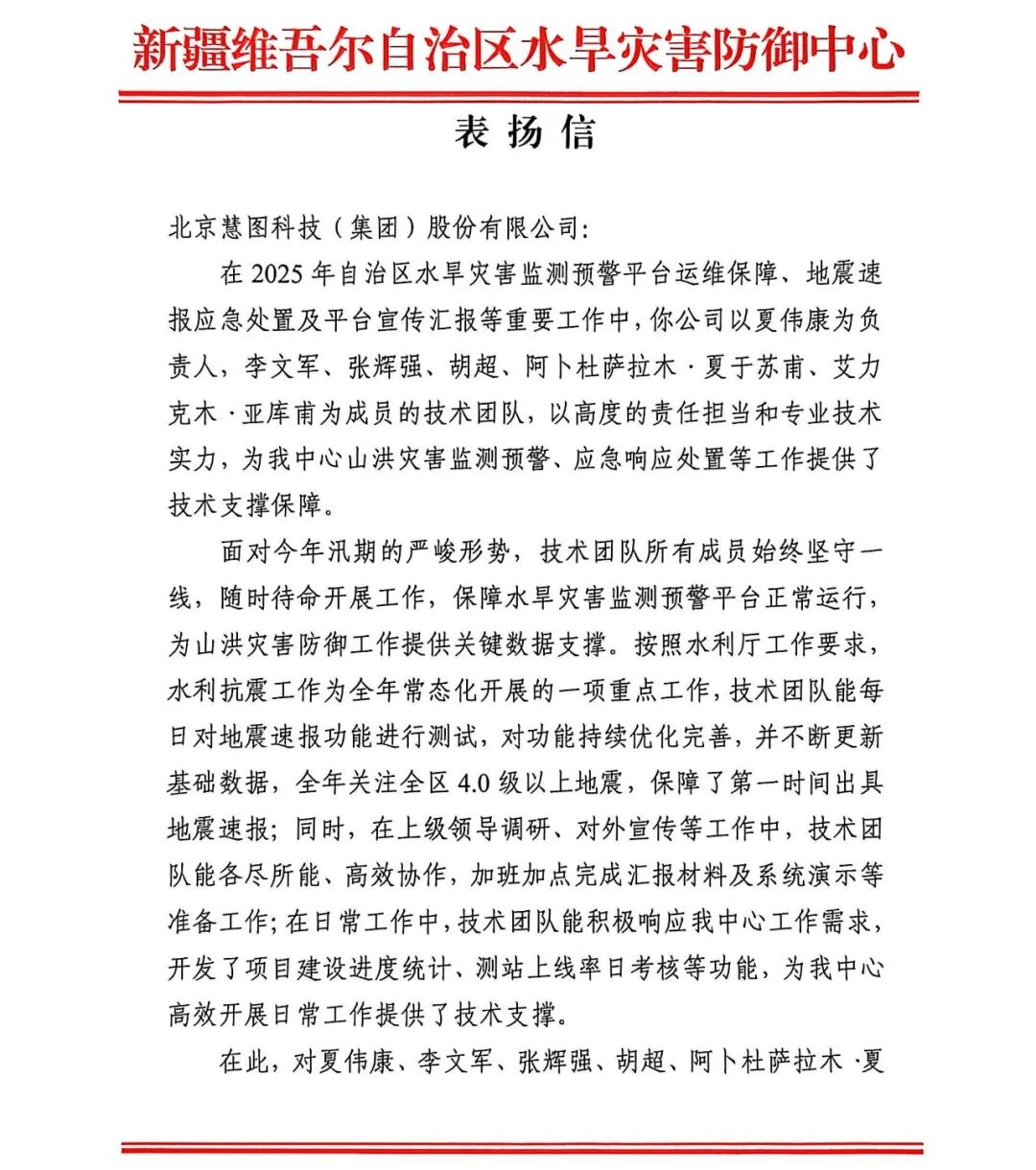 克日,,,,,,新疆维吾尔自治区水旱灾难防御中心发来书面表扬,,,,,,一定新宝gg慧图科技新疆水利厅运维项目手艺团队的日夜坚守与专业支付。。。。。。