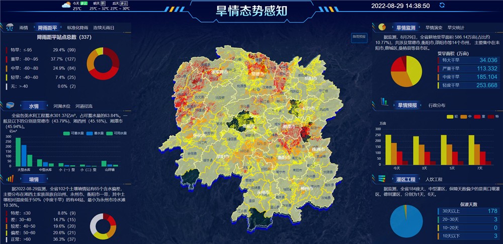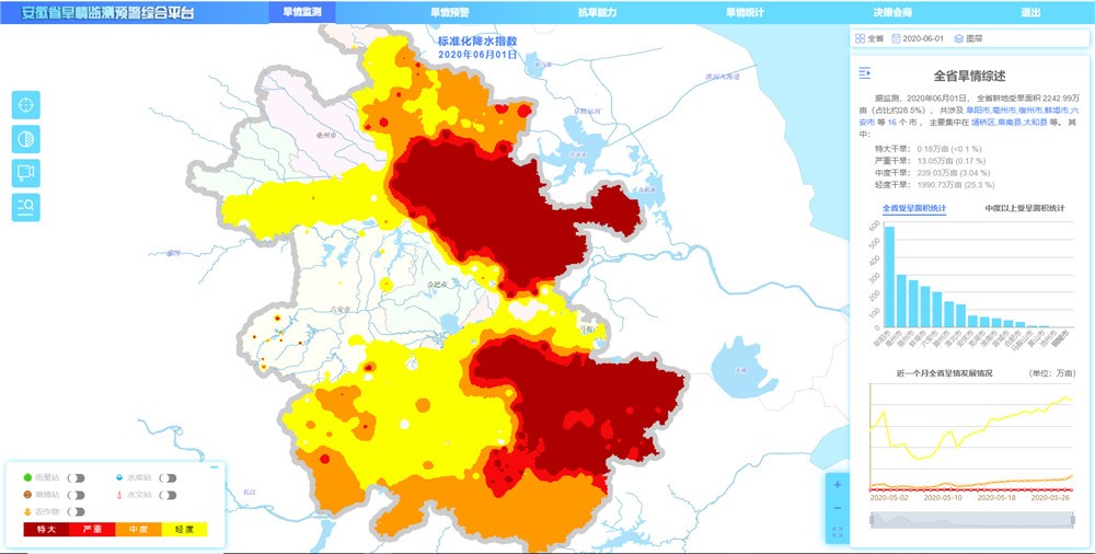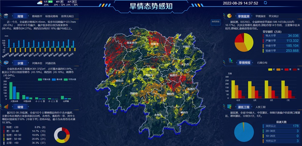 旱情监测预警综合治理平台是在接纳雨水墒情举行旱情剖析的基础上,,,,,,,团结下垫面条件举行旱情的综合评估,,,,,,,特殊是针对区域精准化举行旱情剖析、受旱面积评估、水资源量蓄水与耗水剖析、水文、气象、农业数据的共享、旱情剖析及展示等方面举行研究,,,,,,,一连知足抗旱治理的需求,,,,,,,完善现有监测系统和旱情评估系统,,,,,,,提升旱情监测预警水平。。。。。。。